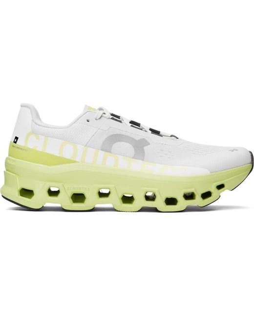 Low-top lightweight knit and mesh sneakers in white and yellow. · Reflective logo and text bonded throughout · Lace-up closure · Padded collar · Jersey lining · Cushioned Helion™ CloudTec® foam rubber midsole · Treaded Speedboard™ rubber sole Supplier color: Frost/Acacia