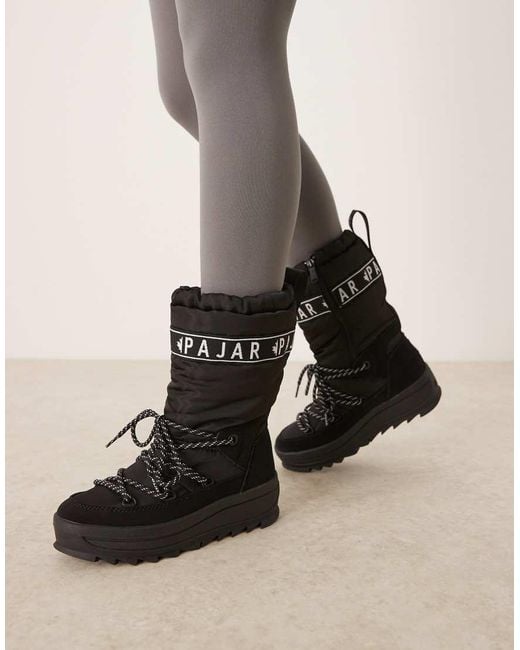 Shoes by Pajar Winter wardrobe staple Seam sealed construction prevents water from getting in Pull tab for easy entry Zip-side fastening Lace-up front Padded cuff Signature Pajar branding Round toe Moulded insole for lightweight cushioning Textured tread. Shearling/Rubber/Leather/Nylon. Colour: black