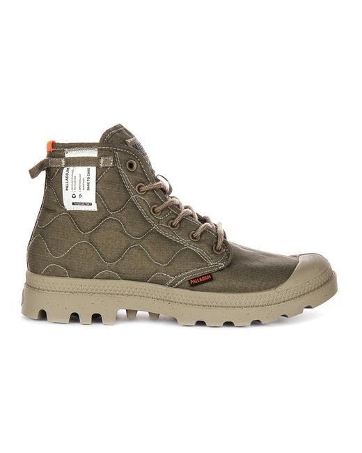 Discover the Palladium Pampa Re-Quiltd lace-up boots in olive, perfect for men and women. Made with canvas fabric and featuring a vegan design with cement construction and concave eyel. Shop now! Colour: green