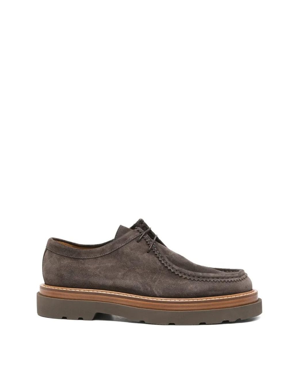 Dark brown suede finish lace-up fastening contrast topstitching ridged rubber sole branded insole Size: 8. Gender: Male. Material:Calf Suede/Calf Suede/Rubber. Colour: brown