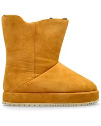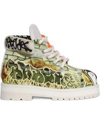 Go to SSENSEAnkle-high nubuck boots in khaki. · Camouflage pattern printed throughout · Lace-up closure · Padded neoprene tongue and collar · Rubberized graphic appliqué at outer side · Logo-embroidered pull-loop and trim at heel