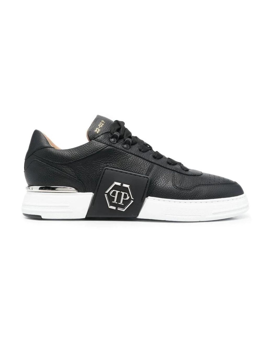 Philipp Plein Lo-Top Phantom Kick$ trainers combine smooth leather construction with the brand’s signature metal Hexagon detail for a bold, everyday casual shoe. Key attributes: Black | Leather | Shock-absorbing rubber midsole | Moulded rubber outsole | Lace-up fastening | Removable insole | Leather lining | PP Hexagon metal plaque on side | Nickel-plated heel stabilizer | Rubberised leather collar | Composition & care: Outer: Leather 100% | Sole: Rubber 100% Colour: black