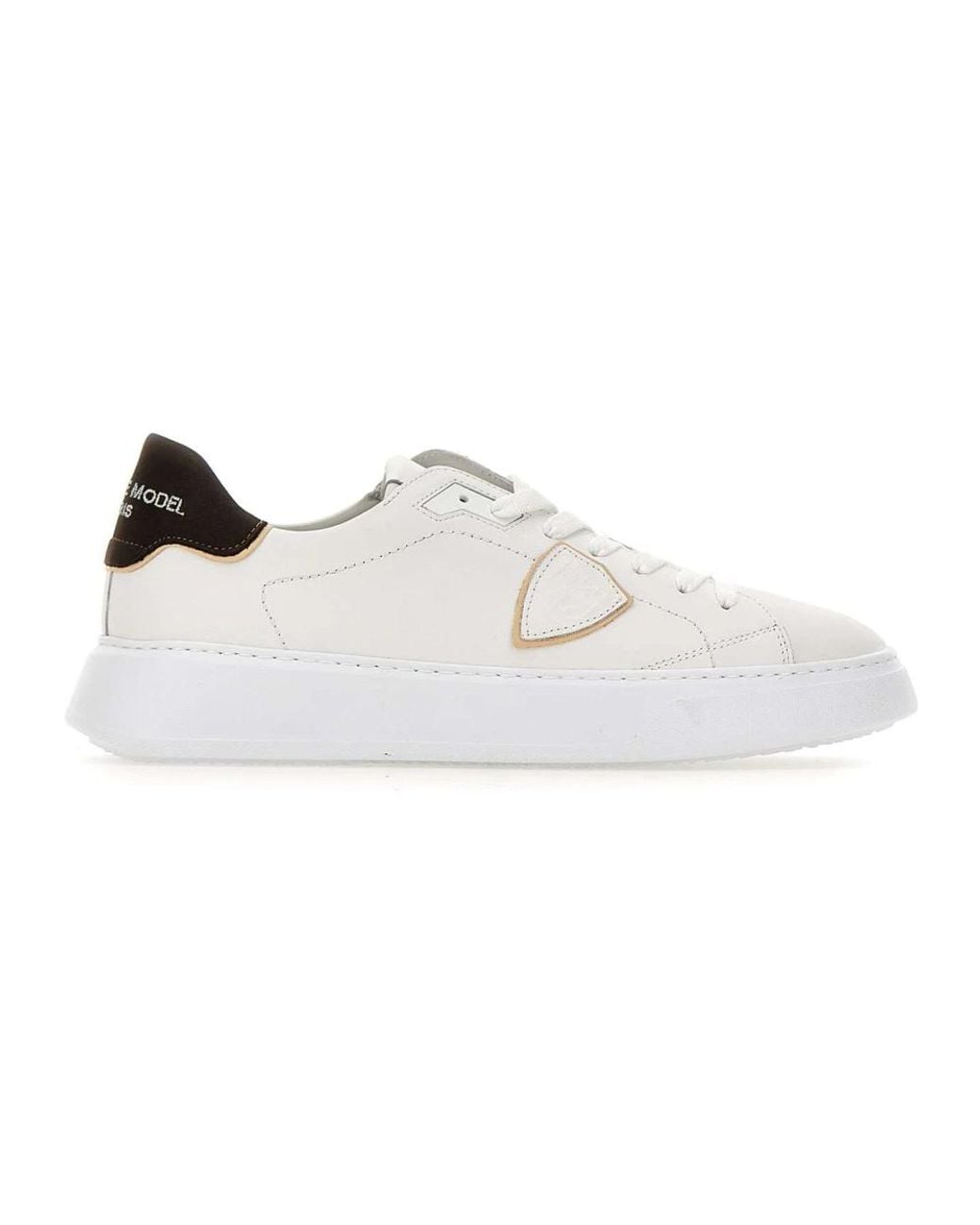 Philippe Model Temple Trainers combine a sleek, '90s-inspired silhouette with a high, ultra-light 4 cm rubber sole for comfortable everyday wear. The design pairs smooth white leather with a contrasting branded heel tab for a refined city look. Key attributes: White | Leather | Breathable technical insole | Lightweight sole | Removable memory foam insole | Cotton terry lining | Contrasting dark brown branded heel tab | Iconic side shield with beige profile | Branded tongue | Flat white cotton laces | Ultra-light rubber sole | Dimensions & fit: Sole height: 4 cm | Regular fit | Composition & care: Leather | Cotton terry lining | Memory foam insole | Breathable technical fabric (insole) | Rubber sole | Cotton laces Colour: white