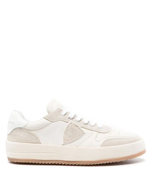Beige calf leather panelled design round toe perforated toebox appliqué logo to the side branded heel counter branded leather insole rubber sole front lace-up fastening Size: 35. Gender: Female. Material:Leather.