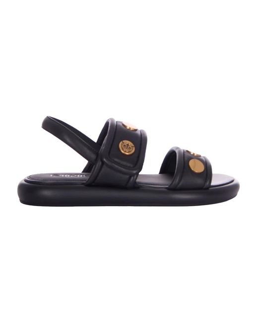 Pinko Fiona 01 Flat Sandals combine a smooth leather finish with a flat, non-slip rubber sole for comfortable everyday wear. The design balances bold metal-detailing with a secure slingback profile for city-ready styling. Key attributes: Black | Nero antique gold | Leather | Non-slip rubber sole | Flat sole with rubber base | Slingback strap for added stability | Hook-and-loop fastening on upper band | Smooth leather finish | Metal stud and gold-tone hardware detailing | Slingback silhouette | Composition & care: Leather (smooth finish) | Upper: synthetic material | Lining and insole: synthetic material | Sole: synthetic (rubber) | Do not wash. Do not bleach. Do not tumble dry. Do not iron. Do not dry clean. Colour: blue
