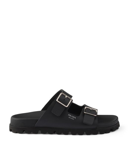 Prada presents this pair of rubber slides as an ode to its flair for laid-back Italian elegance. Their buckled uppers are placed upon a comforting footbed, meaning you can while away the hours with comfort and style always guaranteed. Colour: black