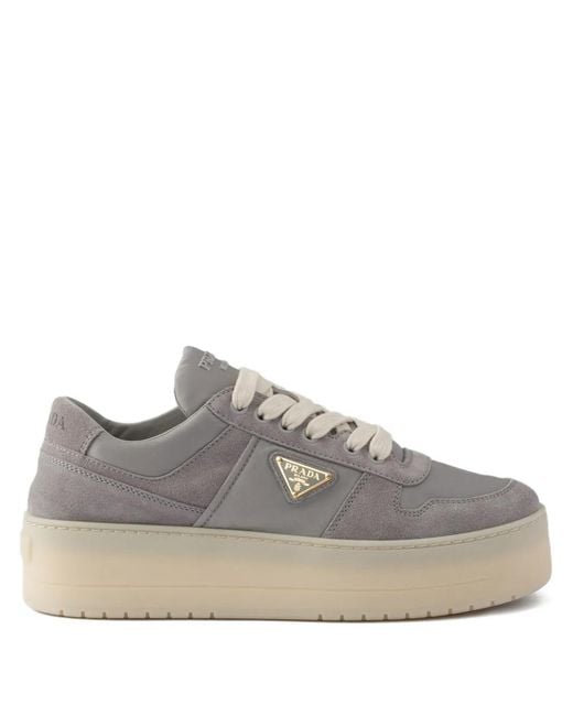 Grey suede panelling enamel triangle logo lace-up fastening rubber sole Size: 35. Gender: Female. Material:Calf Suede/Nylon/Calf Leather/Rubber. Colour: grey