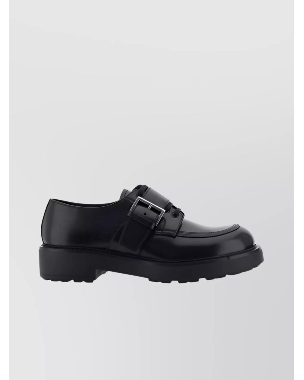 Block heel | Round toe | Patent leather design | Calfskin loafers | Leather front tray | Non-slip sole | Press-stamped logo insole | Adjustable metal buckle | Slip-on style Colour: black