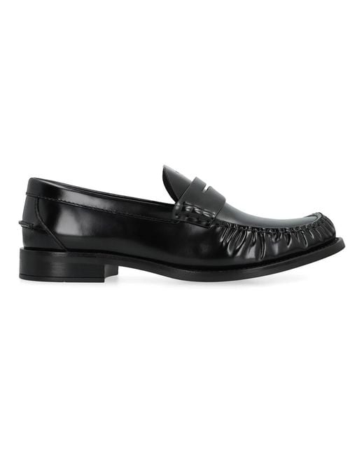 Prada Brushed Leather Loafers are refined leather moccasins with a low stacked heel and a clean vamp band. They pair polished design details with everyday wearability for smart-casual looks. Key attributes: Black | Brushed calfskin leather | Durable monoblock rubber sole | Low 20 mm heel for subtle elevation | One-piece stitched construction | Leather vamp band | Rounded tip | Leather clamp/band across the vamp | Screen-printed Prada logo on upper | Minimal loafer silhouette | Dimensions & fit: Heel height: 20 mm | Composition & care: Outer: 100% calf leather | Lining: 100% calf leather | Sole: 100% calf leather Colour: black