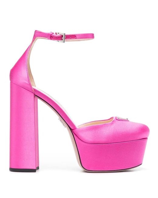 Fuchsia pink calf leather enamel triangle logo square toe buckle-fastening ankle strap branded insole leather lining platform sole 135mm high block heel Size: 38. Gender: Female. Material:Satin/Leather/Leather. Colour: pink