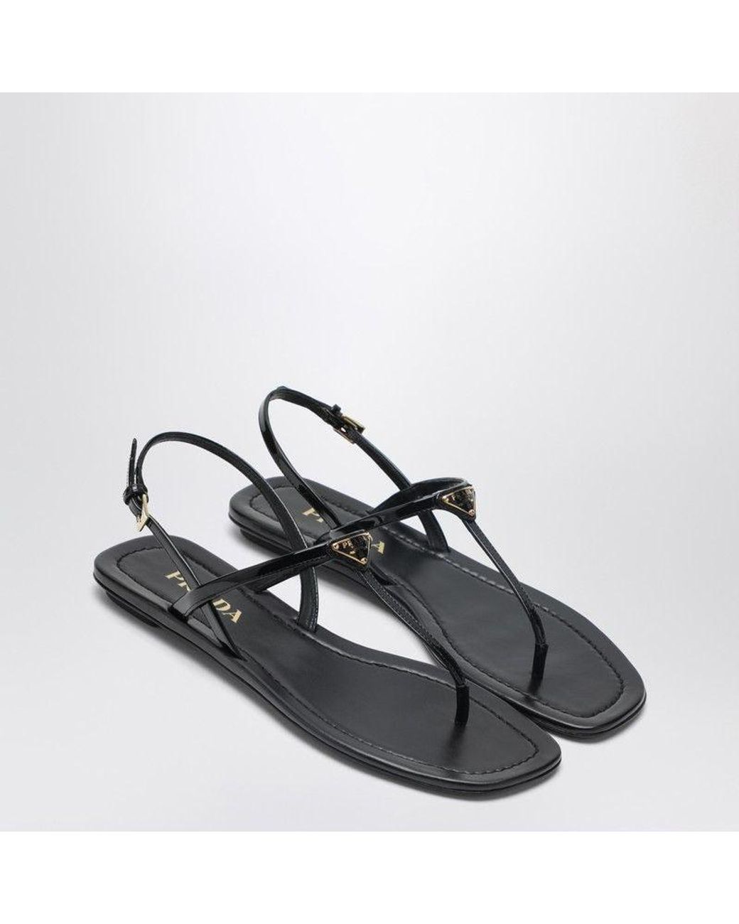 Sandal in black patent leather, featuring thong design, enamelled metal triangle logo on the front, adjustable ankle strap and rubber sole.SpecificationValueSeasonSS26Composition100% LEATHER / RUBBER SOLEColorBLACKColor CodeF0002Made InITALYISOITDepartmentWomenSectionSHOESSubsectionSANDALSSize InformationSHOES ITSize CodeIT Colour: multicolour