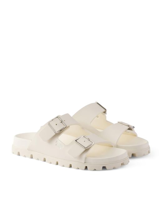 Slides are a staple warm-weather shoe the world over, with this take from Prada a pared-back example. Crafted from snow-white rubber and detailed with a heavy lug sole for an androgynous feel, the miniature logo embossed to the sidewall offers subtle branding. Colour: white
