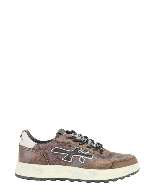 Trainers - Premiata - Nous model - Brown colour - Round toe - Suede inserts - Fabric upper - Appliqué logo on side - Leather loggata reinforcement on heel - Loggata tongue - Fabric laces - Molded rubber sole. Colour: brown