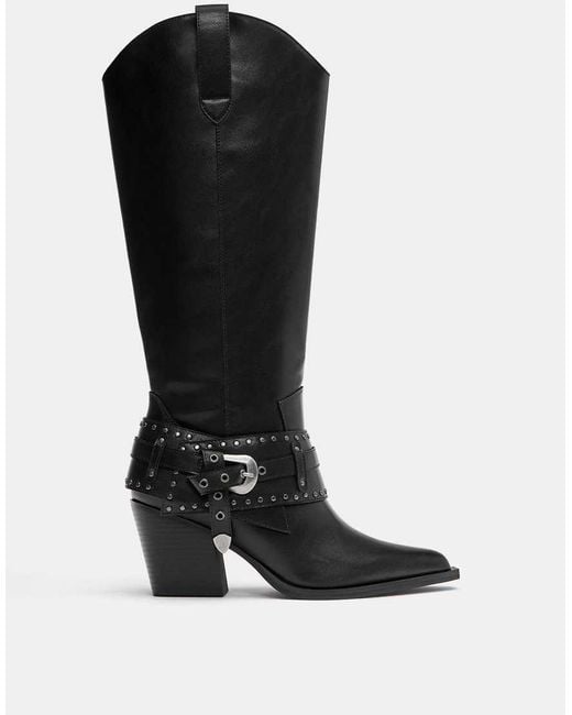 Shoes by Pull&Bear Knee-high style Side tabs Zip-side fastening Buckle detailing Stud embellishment Western styling Almond toe Flat sole Mid block heel. Polyurethane. Colour: black