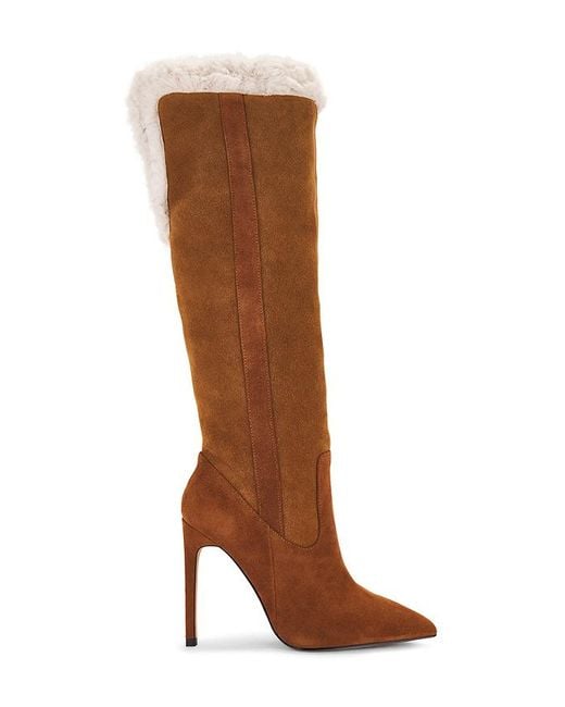 RAYE Cruz Boot in Brown. Size 10. Also in 8, 8.5, 9. RAYE Cruz Boot in Brown. Size 8, 8.5, 9. Suede upper with faux fur lining and manmade sole. Made in China. Pull-on styling. Pointed toe with stiletto heel. Approx 108mm/ 4.25 inch heel Approx 387mm/ 15.25 inch shaft Shaft measures approx 12.56 in circumference. RAYE-WZ2793. RYSH1917 R24. Inspired by the word Reina, the Spanish word for queen, Raye is the queen bee shoe brand that will surely capture your heart. With an extensive assortment of silhouettes from heels to boots and sandals to flats, Raye has that perfect something for everyone.