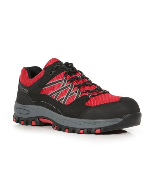 Water resistant, comfortable and protective - our Sandstone safety shoe will help you get the job done.Featuring PU nubuck and breathable mesh, the men's safety shoes will keep feet fresh whilst providing comfortable, lightweight protection. There's a water-resistant coating to prevent light rainfall getting through. The men's work shoes come packed with protective features including an oil resistant outsole and a steel toe cap. The flexible midsole provides the comfort you'll need when working on your feet all day. Cut in a trainer design. Conforms to EN20345: 2011 - SB Steel toe cap with oil resistant outsole PU nubuck and breathable mesh upper for lightweight protection Water resistant upper with padded ankle protection EVA midsole for flexibility and all day comfort Moulded EVA comfort footbed Oil resistant durable rubber outsole Made using recycled materials Work Work Shoes Workwear Safety Boots Colour: red