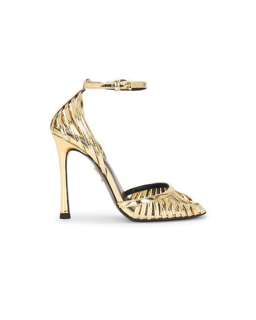 Retrofete Analu Heel in Metallic Gold. Size 36. Also in 37, 38, 39, 40, 41, 38.5, 39.5, 40.5. retrofete Analu Heel in Metallic Gold. Size 37, 38, 39, 40, 41, 38.5, 39.5, 40.5. Metallic patent leather upper with manmade sole. Made in China. Ankle buckle closure. Leather footbed and lining. Strappy design. Almond peep toe with stiletto heel. Approx 100mm/ 4 inch heel. ROFR-WZ37. R-SS25-11217-SH. Retrofete, launched in 2018 by co-founders Ohad Seroya and Aviad Klin, embodies the glamour and opulence of decades past. Having gained notoriety for its sequin-clad party frocks, the New York-based label has evolved into a collection of daring, top-to-toe designs that seamlessly transform from day to night. Regardless of where she goes, you can count on the Retrofete girl to bring the party.