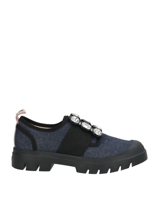 ROGER VIVIER. slip on, denim, plain colour with appliqués, crystals, grosgrain trims, leather lining, round toe, rubber heel, rubber sole, contains non-textile parts of animal origin. Textile fibres.