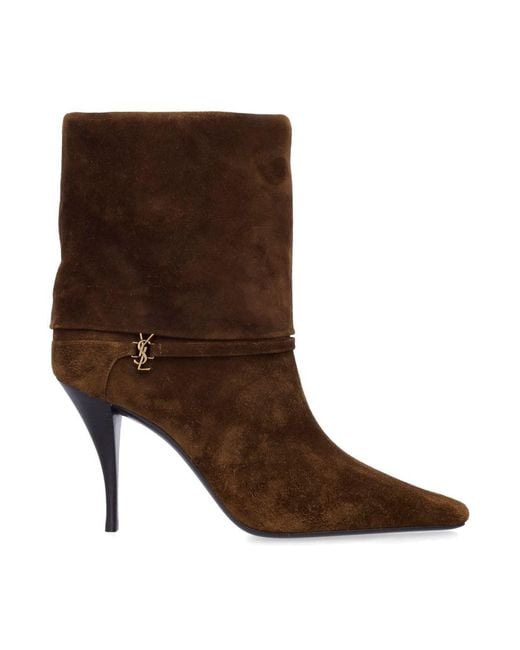 Niki booties by Saint Laurent.. Featuring:. Suede leather upper. Point toe. Ankle strap with Cassandre. Stiletto heel. Heel: 9 cm. Gender: Women. Material: 100% CALF LEATHER. Color: LAND. Made in: IT. Product ID: 25A8013930LI00#2701. *Import tax/duty will be calculated at checkout (If applicable)