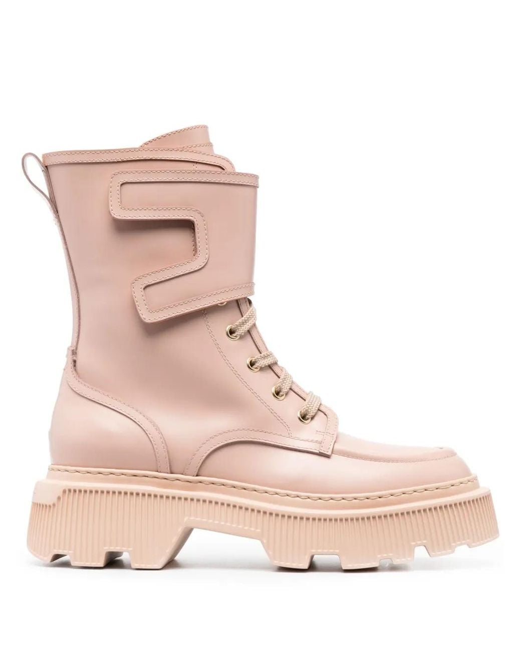 Light pink calf leather front lace-up fastening side zip fastening round toe branded insole flat rubber sole Size: 38 1/2. Gender: Female. Material:Leather.
