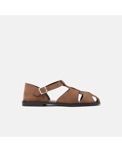 Inspired by footwear worn by fishermen, the Apollo sandals feature wide leather bands and adjustable square buckle-adorned fastening. These are perfect for casual looks, paired with linen trousers, wide-leg jeans or summer-ready bottoms. Hand-crafted strappy sandals Taupe suede Silver-tone metal buckle Black leather sole Colour: brown