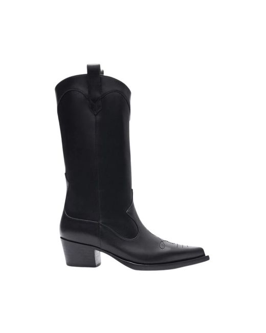 Scarosso's Dolly Boot is a mid-calf cowboy-style boot that pairs decorative stitching with a mid-height block heel for confident everyday wear with a Western silhouette. Key attributes: Black | Calf leather | Pull-on style | Leather sole | Mid-calf cowboy silhouette | Subtle ornate decorative stitching | Block heel | Snip/pointed toe | Pull tabs at the shaft opening | Dimensions & fit: Heel height: 5 cm | Fits true to size — we recommend trying your usual size. | Composition & care: Outer: 100% calf leather | Lining: 100% calf leather | Store away from direct light and heat. Protect from moisture and rain. Use the protective dust bag when not wearing. Follow professional leather care guidelines as needed. Colour: black