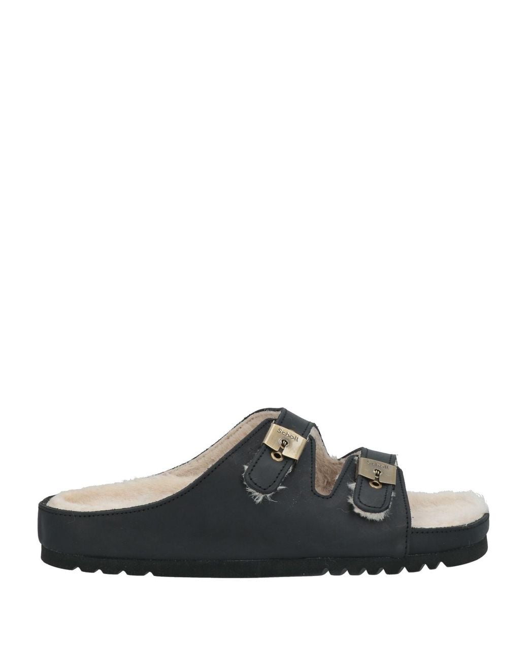 SCHOLL. sandals, leather, plain colour, brand logo, plush fabric inner, buckle fastening, round toe, flat, rubber cleated sole, contains non-textile parts of animal origin. Leather.