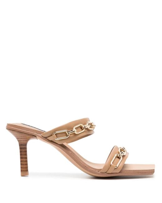Butterscotch brown leather smooth grain chain-link detailing square open toe slip-on style branded footbed 80mm high heel Size: 36. Gender: Female. Material:Leather.