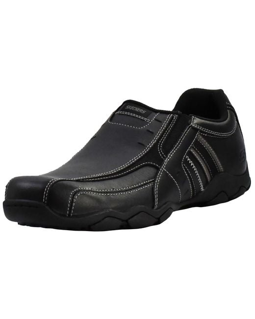 Skechers Mens Diameter Heisman slip on leather loafer shoe black smooth leather upper in a slip on casual moc design. Contrast coloured image stitching accents & metal stud detail. Embossed SKECHERS logo. Dual side elastic fabric panels for easy slip on fit. Padded collar with heel pull on tab. Soft fabric shoe lining. Cushioned relaxed step comfort pack insole. Shock absorbing midsole & flexible traction outsole. Side stripes with perforation accents & canvas edging. Dual stiched seam bicylce style toe design. Skechers Mens Diameter Heisman slip on leather loafer shoe black smooth leather upper in a slip on casual moc design. Contrast coloured image stitching accents & metal stud detail. Embossed SKECHERS logo. Dual side elastic fabric panels for easy slip on fit. Padded collar with heel pull on tab. Soft fabric shoe lining. Cushioned relaxed step comfort pack insole. Shock absorbing midsole & flexible traction outsole. Side stripes with perforation accents & canvas edging. Dual stiched seam bicylce style toe design. Memory Foam. Relaxed Fit. Silver/Blue with Memory Foam.