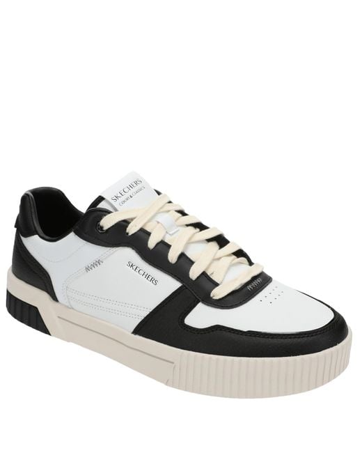 Court style trainer Shock absorbing vulcanised midsole Duraleather and contrast colour overlay upper Flexible traction outsole Skechers Air-Cooled Memory Foam. Colour: black