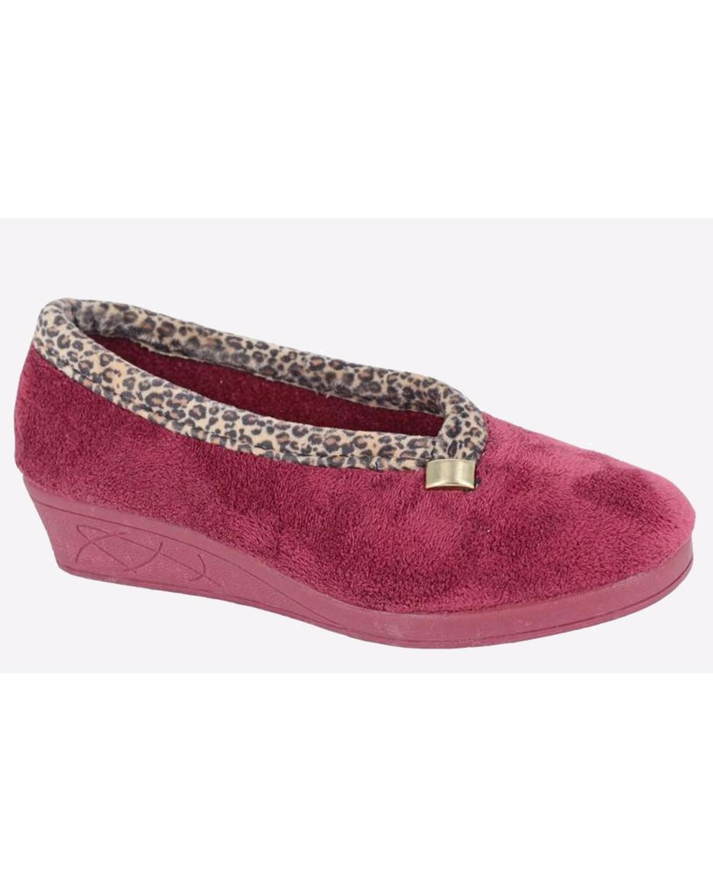 Elevate your loungewear with the luxurious Dawn slippers in striking burgundy, accentuated with leopard print trim. Crafted with a velour upper with the knitted lining and sock, and complete with wedge heel these slippers remain fashionable and comfortable. - Velour upper - Wedge heel - Knitted lining and sock - Slip on design for easy on / off wear - TPR sole Colour: red
