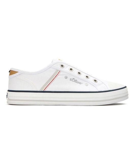 Womens white S Oliver canvas slip-on trainers, manufactured with cotton and a rubber sole. Featuring: engraved ring branding, concealed gussets, slip-on and soft foam insole. Colour: white