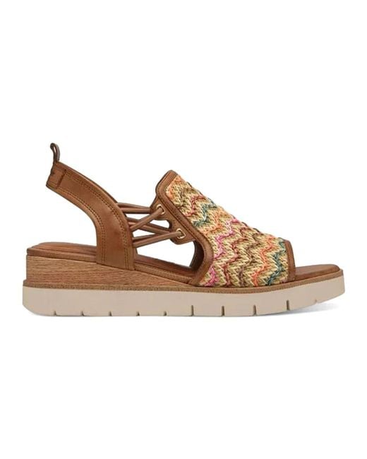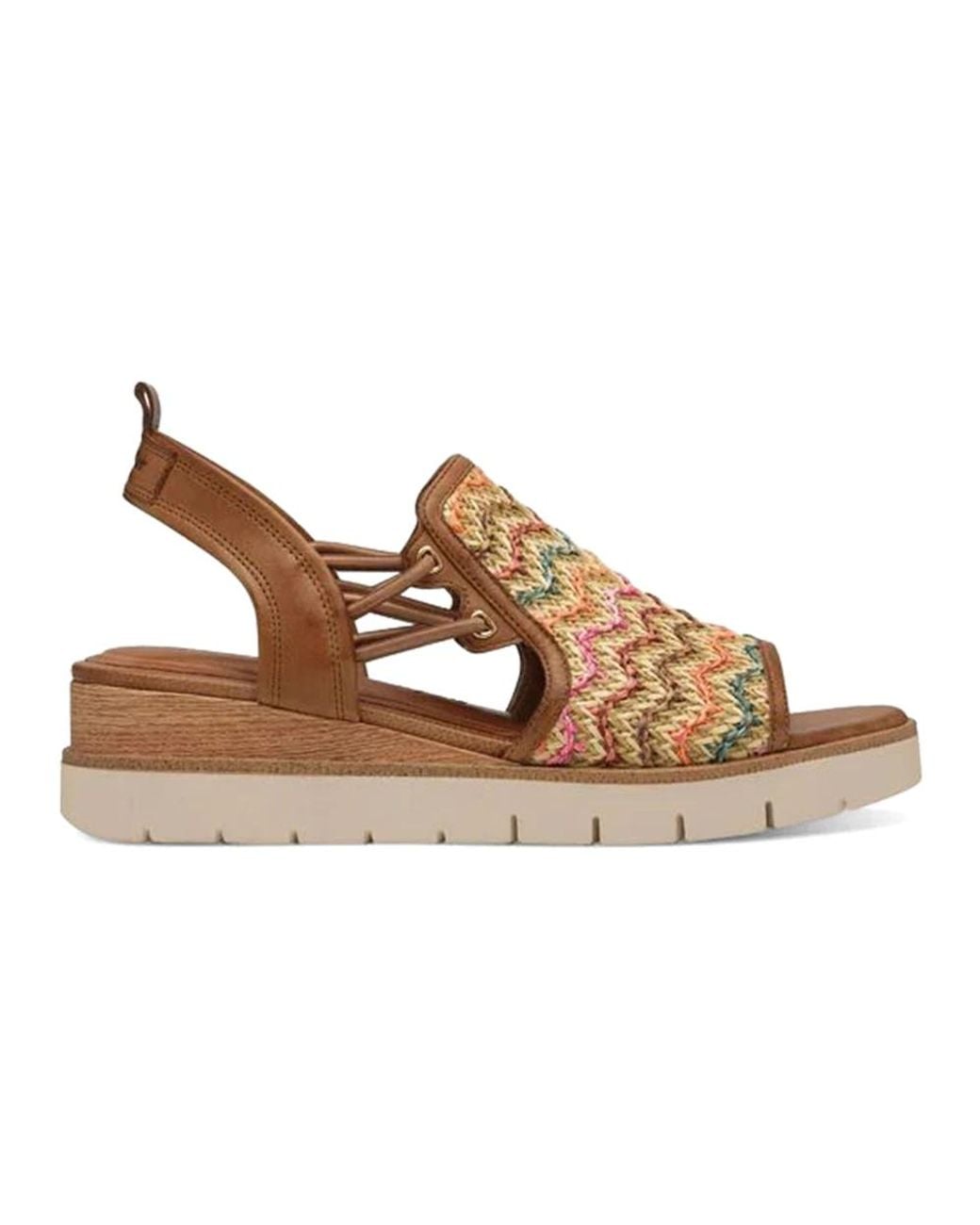 Step into summer with these elegant Tamaris sandals! Featuring a modern look with eye-catching strap details, a woven upper, and a comfortable blend of leather and textile. The 5.0 cm wedge heel offers stability and style, perfect for leisure, summer events, and shopping. Ideal for sunny days, these sandals add a boho charm to any outfit. Article number: 1-28240-44-902. Heel type: Wedge sole. Heel height: 50 mm. Insole: Material mix with leather and textile. Outer material: Material mix with leather and textile. Inner material: Textile. Platform height: 25 mm. Removable insole: No. Sole: Synthetic. Colour: brown