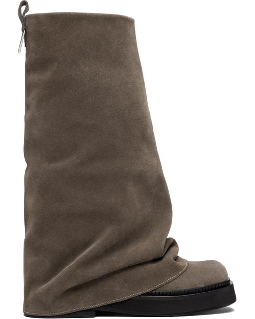 Knee-high suede boots. · Layered construction · Square toe · Pull-loop and logo hardware at heel collar · Buffed leather lining · Serrated edge at welt · Stacked foam rubber midsole and heel · Leather sole Supplier color: Taupe Colour: brown