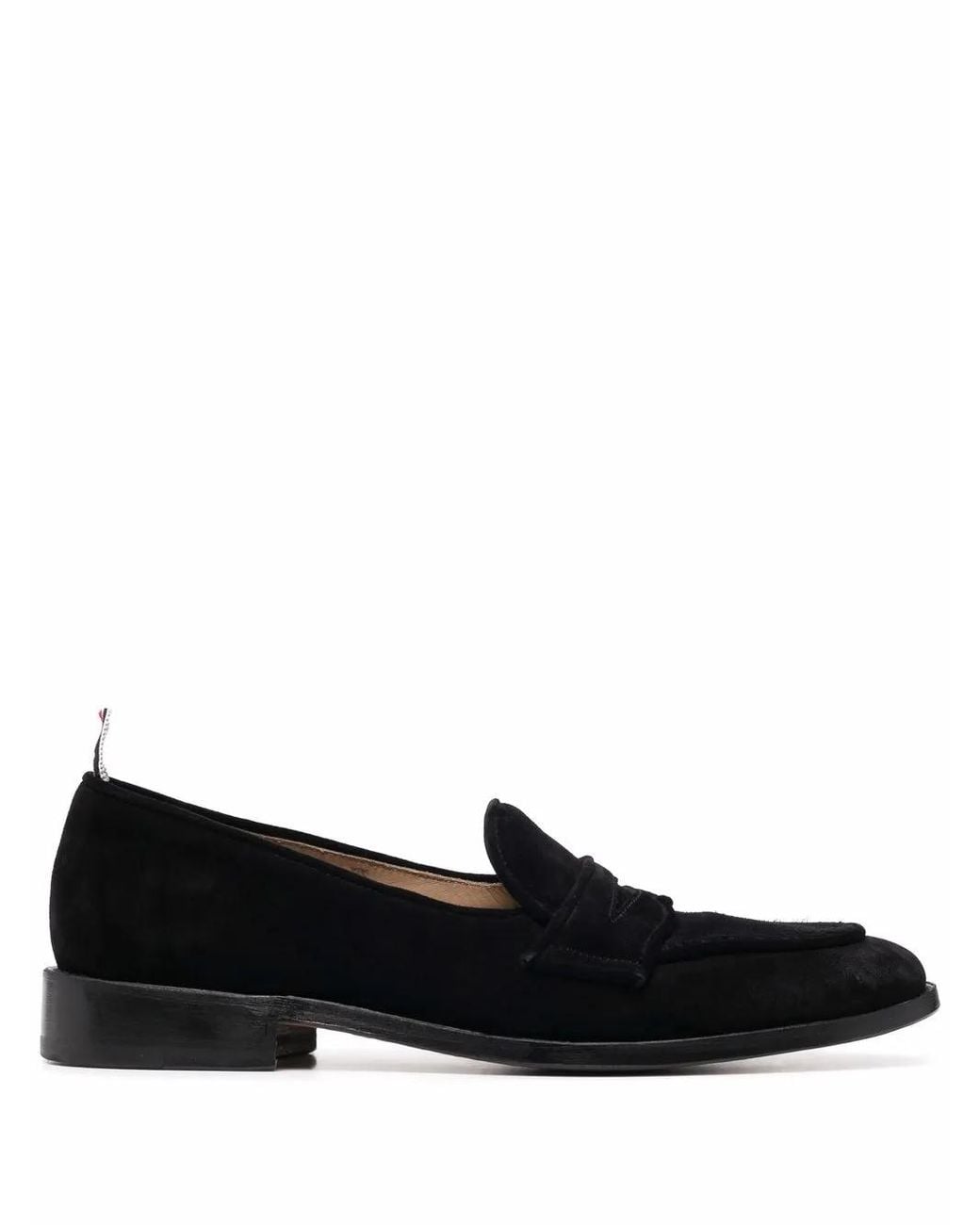 Black leather/suede almond toe penny slot branded insole slip-on style logo pull-tab at the heel RWB stripe low heel Size: 9. Gender: Male. Material:Leather/Leather/Suede.