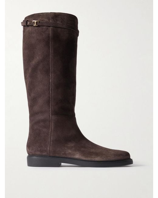 Tod's boots have the elegant practicality of riding styles. They've been made in Italy from suede with a slim buckled strap draped at the brim. Wear them over slim jeans or leggings. Colour: brown