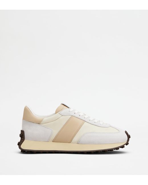 A sophisticated sporty taste characterizes these new trainers, with Tod's logo stamped on the tongue. Crafted in suede with technical fabric inserts, they feature a rubber outsole with iconic embossed detailing. Colour: white
