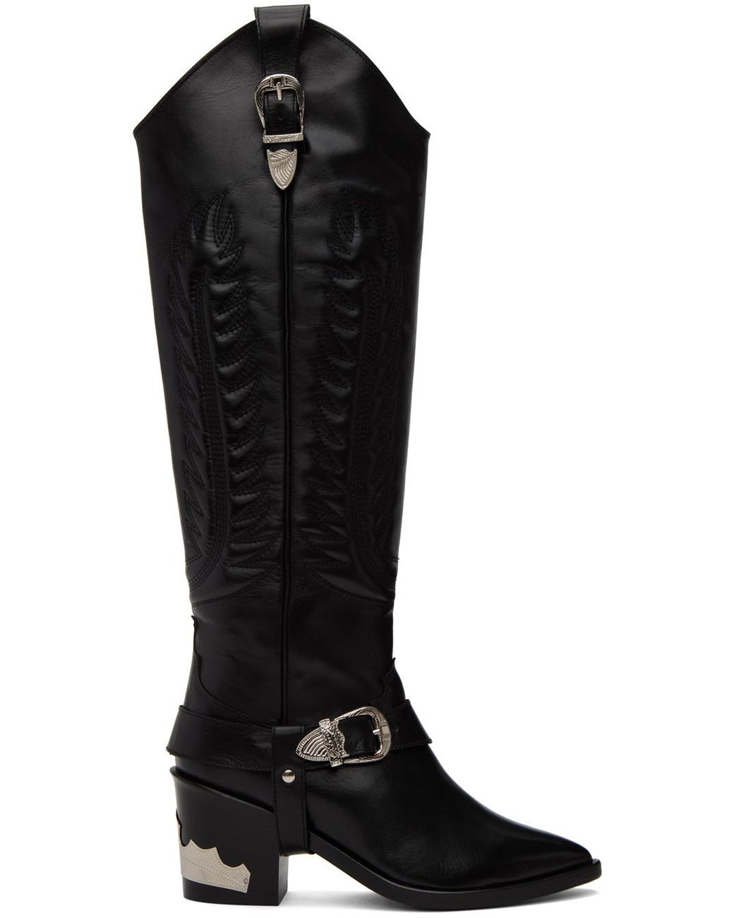 Knee-high buffed leather boots in black. Topstitch detailing and piping throughout. · Pointed toe · Adjustable pin-buckle fastening at vamp · Pull-loops at collar · Pin-buckle fastening at mismatched pull-loop · Stacked leather block heel with metallic trim · Leather sole · Heel: H2.7 in Supplier color: Black