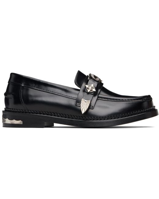 Polished leather loafers. · Moc toe · Strap with graphic hardware at vamp · Pinched seam at heel counter · Serrated detailing at welt · Plaque at heel · Stacked leather heel with rubber injection · Leather sole Supplier color: Black Colour: black