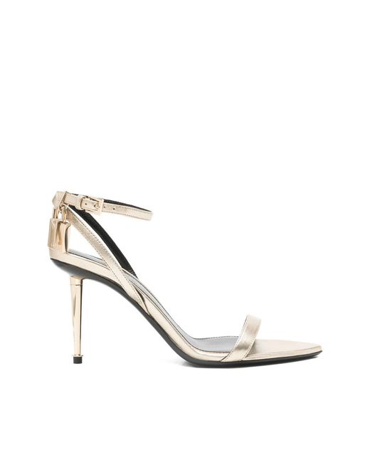 Gold-tone padlock detail open toe stiletto heel pointed toe laminated nappa leather adjustable buckle ankle strap This piece comes complete with a protective dust bag. Colour: white