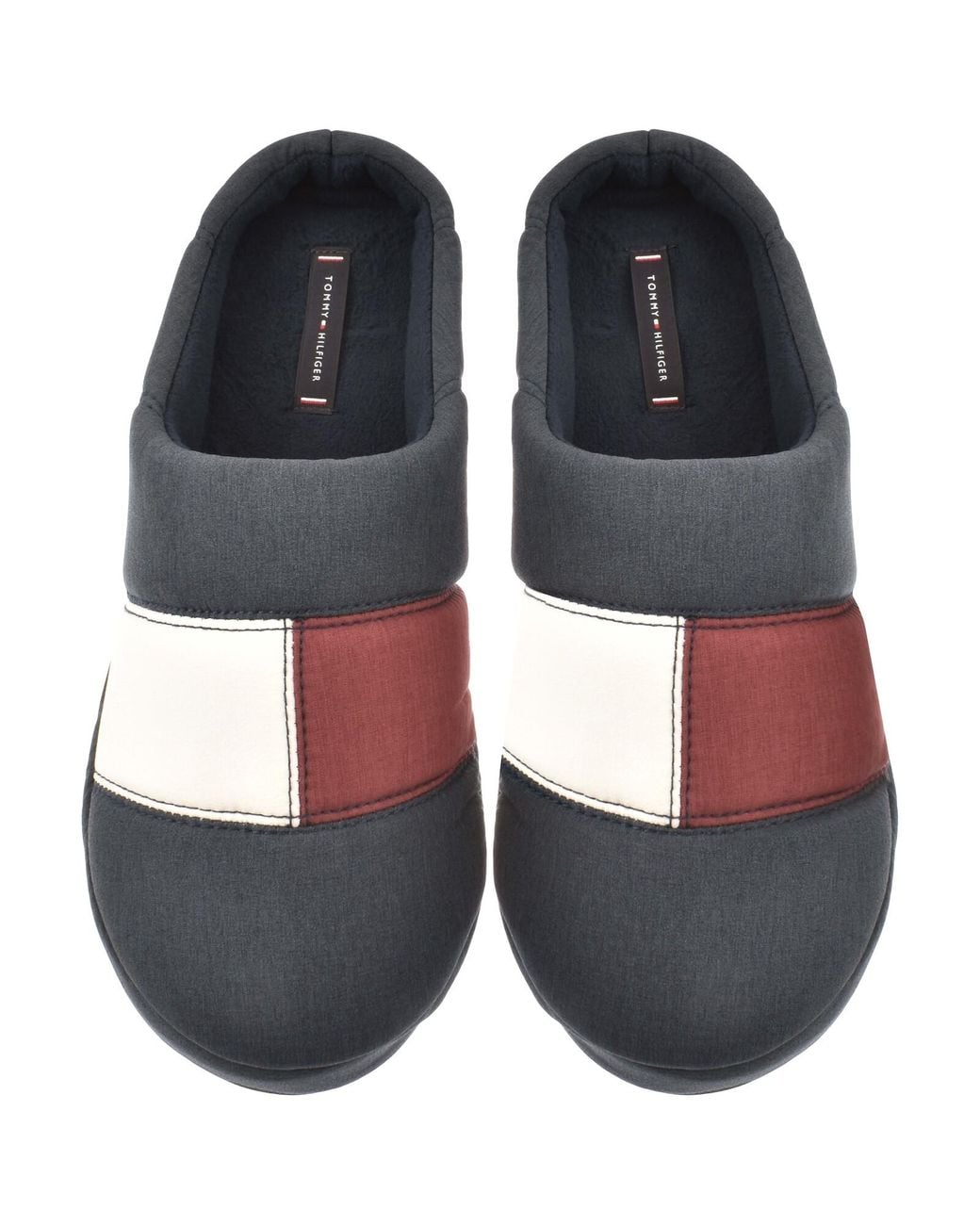 Tommy Hilfiger Flag House Slippers In Desert Sky Navy. A slip on design featuring the Tommy Hilfiger Flag logo. A soft fleece interior and a branded thermoplastic rubber outsole for grip. Colour: black