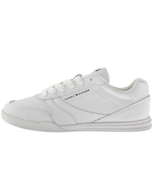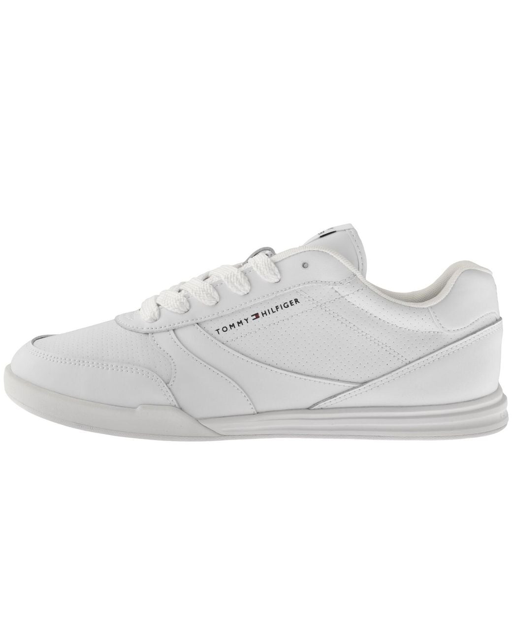 Tommy Hilfiger Logo Cupsole Trainers In White. A mixed leather design featuring perforated panels for ventilation. A lace fastening and a Tommy Hilfiger logo patch featured on the tongue. A rubberised Tommy Hilfiger Flag logo features on the heel with an additional logo on the outstep. A branded rubber midsole and outsole. Colour: white