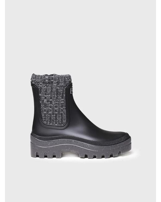 CAMOS. This women's water boot is made in plain colours with a matte finish. The contrast between the side in mottled knit fabric and the rubber gives a very original touch to this model. It is a comfortable and warm waterproof boot, ideal for winter. This boot fits the usual size. Size: 36, 37, 38, 39, 40, 41 Colour: blue