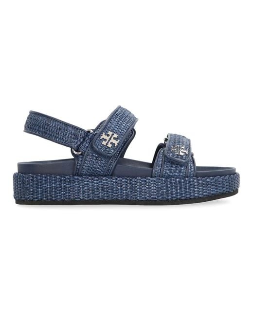Tory Burch Kira Sport Sandal pairs an intrecciato-style raffia-and-nylon upper with a molded leather footbed for comfortable day-to-evening wear. Key attributes: Blue | Nylon | Cushioned leather footbed for comfort | Durable rubber outsole | Adjustable hook-and-loop (Velcro) straps | Molded leather footbed | Rubber sole for traction | Interwoven (intrecciato) upper | Round toeline | Signature logo detail on straps | Dimensions & fit: True to size | Composition & care: 75% Nylon | 25% Raffia | 100% Leather | Avoid moisture exposure. Clean with a dry cloth and store in the dust bag. Handle with care to preserve the weave and leather. Colour: blue