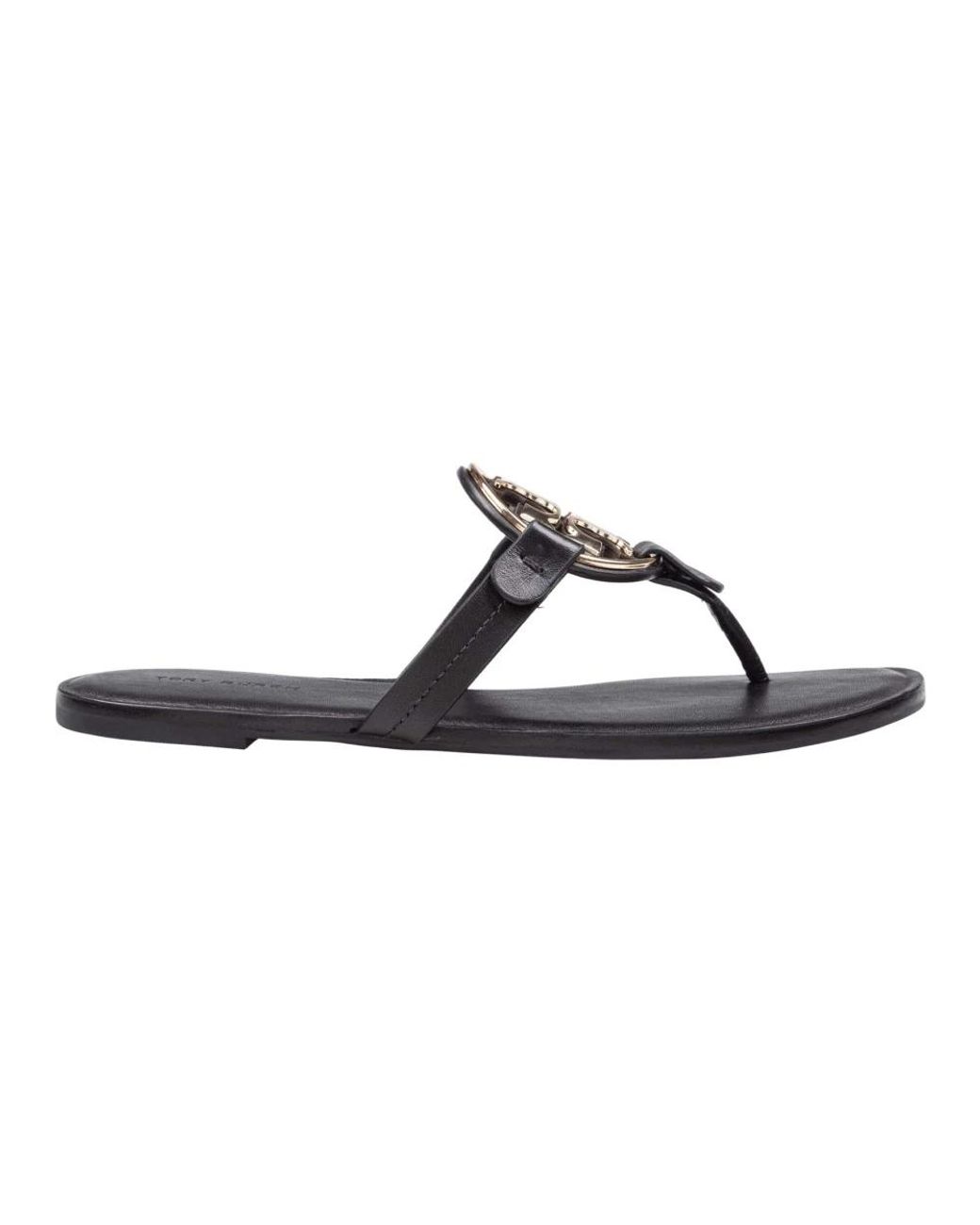 Tory Burch Metal Miller Sandal — a leather flip-flop that combines a cushioned leather insole with a flexible rubber sole for comfortable, elevated everyday wear. The signature metal logo detail adds refined, versatile style. Key attributes: Black | Gold | Calf leather | Flexible rubber sole | Padded leather insole | Cushioned leather footbed | Smooth leather toe post | Dust bag included | Metal logo buckle | Laser-cut logo with metal overlays | Hand-painted edges with tonal stitching | Dimensions & fit: Footbed width: 2.17" (55 mm) at instep | Composition & care: Calf leather (upper) | Cushioned leather footbed | Smooth leather toe post | Rubber sole | Metal hardware (gold-tone) Colour: blue