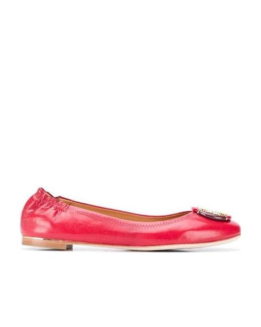 Red round-head flats, decorated with gold hardware, logo, insoles decorated with logos, low heels, rubber soles. Colour: pink