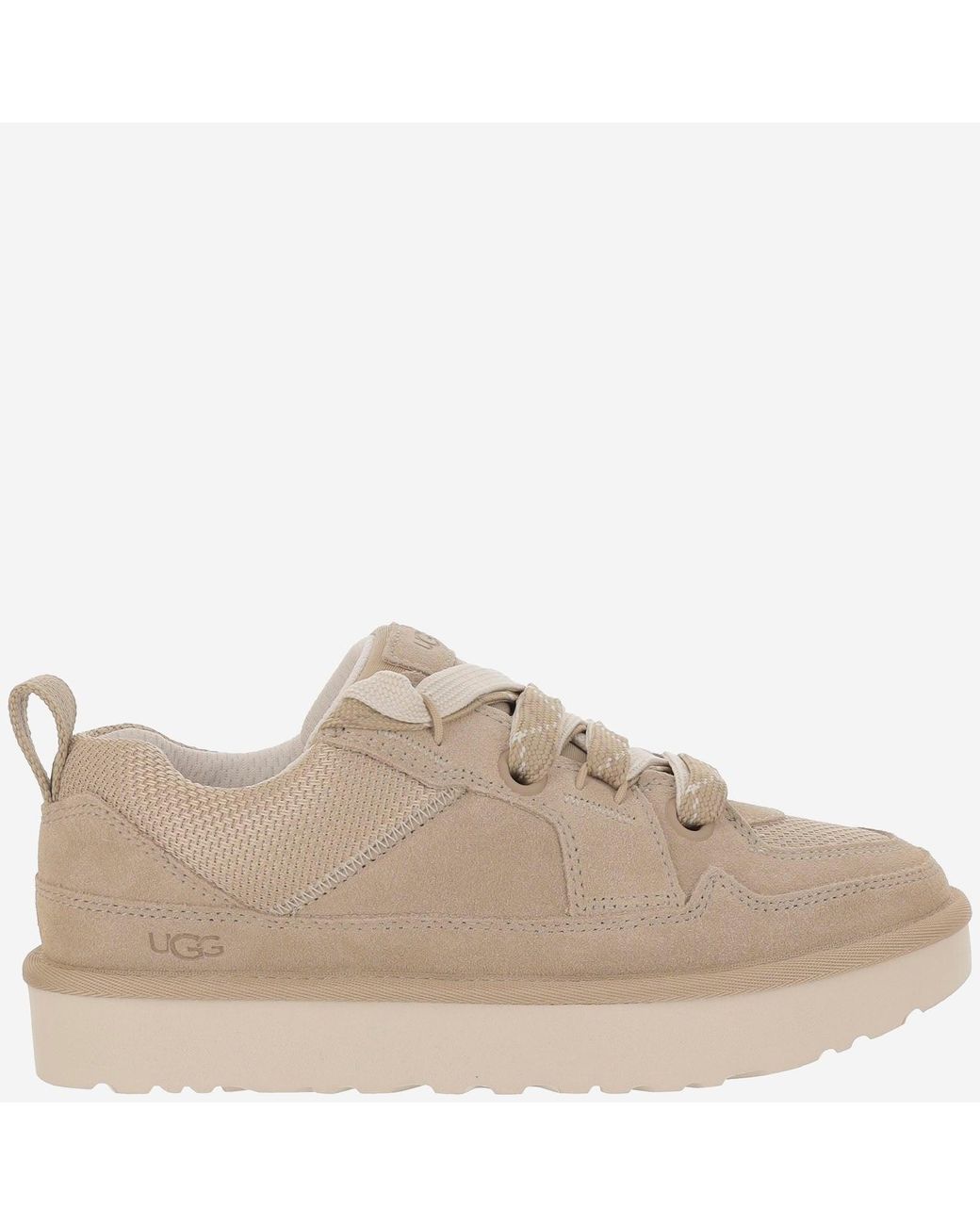 Trainers made of suede Upper with woven canvas mesh Lace-up closure Round toe Laser-engraved logo Rubber sole Beige Made in Vietnam Composition: 100% leather, 100% fabric
