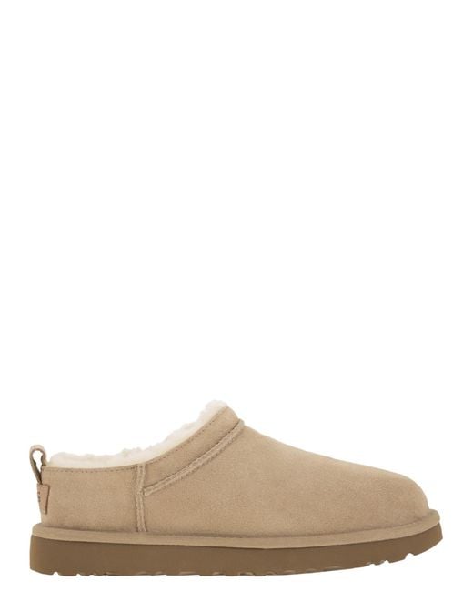 The Classic Micro reinvents the beloved Classic boot with a new low-profile design (and extraordinary comfort). It features a genuine suede upper lined with ultra-soft sheepskin, a material that naturally regulates temperature, allowing you to choose whether to wear socks or not. The lightweight EVA sole made from sugar cane provides natural support and makes it as comfortable as a slipper. - Suede or suede upper with topical water repellent treatment or water-resistant suede - Back pull tab - Sheepskin lining (10 mm), sheepskin lining (17 mm) - Sheepskin insole (17 mm) - Sugarcane EVA sole - Fabric trim made from recycled polyester fibres (100%) - Fabric label with UGG® logo on the insole, leather label with embossed UGG® logo on the heel - This product is made with real sheep or lamb fur DESIGNER ID: 1173891 SANSpecificationValueYear2025SeasonFALL / WINTERMaterialsUpper: Suede Lining: Sheepskin Sole: EVA from sugar caneColorSANDColor CodeSANMade InVietnamMeasuresSole height: 3 cmGenderWomenSize FormatUS Colour: brown