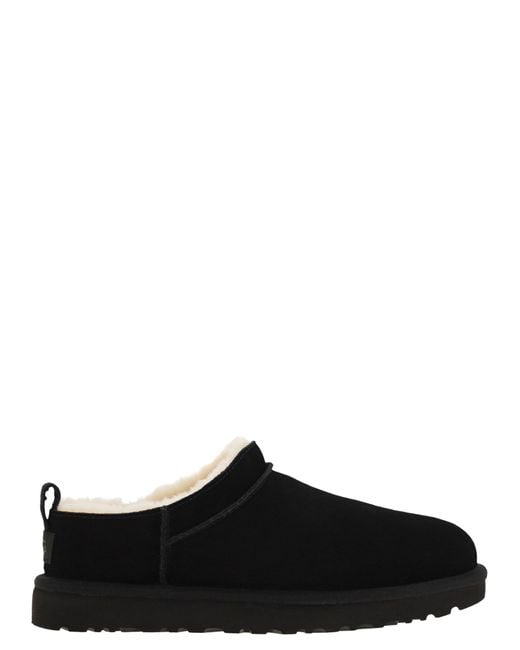 The Classic Micro reinvents the beloved Classic boot with a new low-profile design (and extraordinary comfort). It features a genuine suede upper lined with ultra-soft sheepskin, a material that naturally regulates temperature, allowing you to choose whether to wear socks or not. The lightweight EVA sole made from sugar cane provides natural support and makes it as comfortable as a slipper. - Suede or suede upper with topical water repellent treatment or water-resistant suede - Back pull tab - Sheepskin lining (10 mm), sheepskin lining (17 mm) - Sheepskin insole (17 mm) - Sugarcane EVA sole - Fabric trim made from recycled polyester fibres (100%) - Fabric label with UGG® logo on the insole, leather label with embossed UGG® logo on the heel - This product is made with real sheep or lamb fur DESIGNER ID: 1173891 BLKSpecificationValueYear2025SeasonFALL / WINTERMaterialsUpper: Suede Lining: Sheepskin Sole: EVA from sugar caneColorBLACKColor CodeBLKMade InVietnamMeasuresSole height: 3 cmGenderWomenSize FormatUS Colour: black