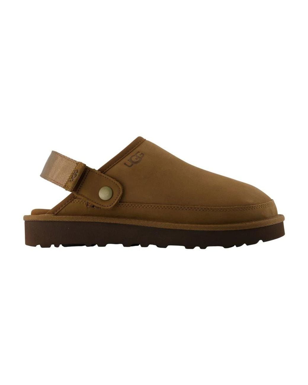 UGG Goldencoast Clog II Nubuck combines cushioned comfort with easy slip-on convenience. Its lightweight design and adjustable heel strap make it ideal for casual, everyday wear. Key attributes: Brown | Dark chestnut | Smooth calfskin | Water-resistant leather | Lightweight EVA outsole | Slip-on closure | Adjustable hook-and-loop heel strap | Slide / clog silhouette | Round toe | Adjustable heel strap | Dimensions & fit: True to size — EU sizing | Composition & care: Smooth calfskin Colour: brown